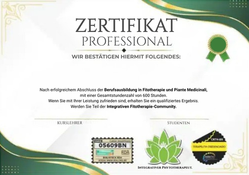 Unser Programm ist von der Internationalen Föderation für Ganzheitliche Therapien (FITAH) zertifiziert, mit dem Zertifizierungscode FITAH-Nr. 9.394/2008. Diese Zertifizierung garantiert, dass unser Material den höchsten internationalen Standards in der Lehre der Phytotherapie entspricht und Qualität sowie Gültigkeit in allen Ländern der Welt sicherstellt.